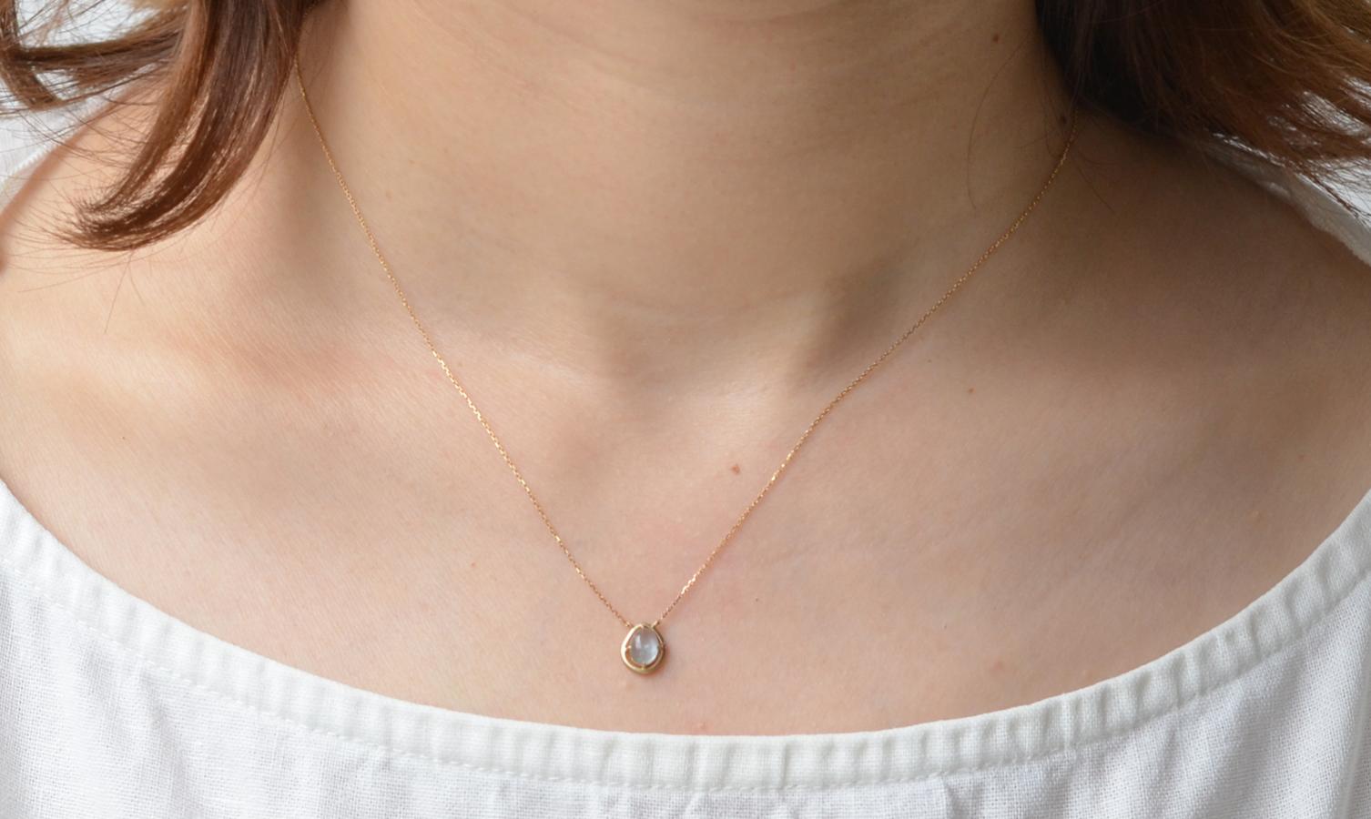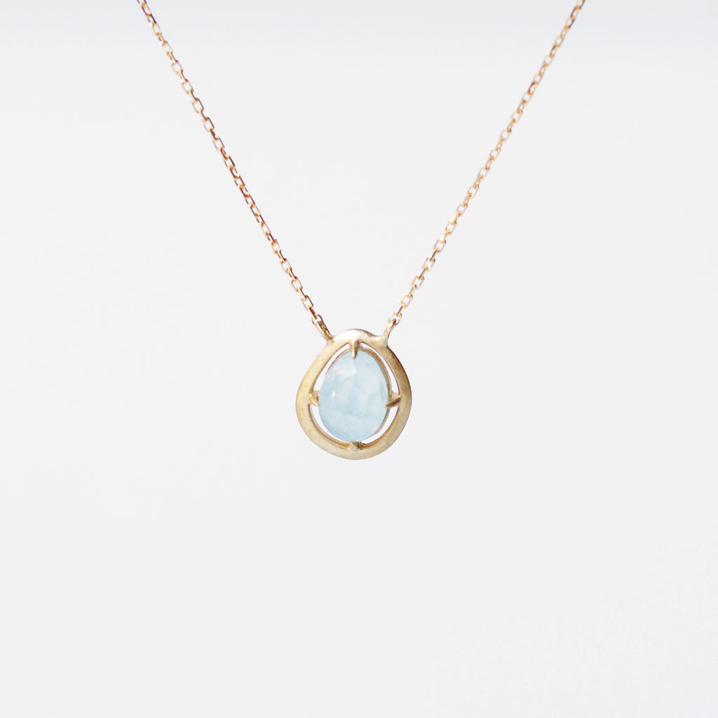 丸みを帯びたフレームとミルキーアクアマリンが柔らかい印象のネックレス。