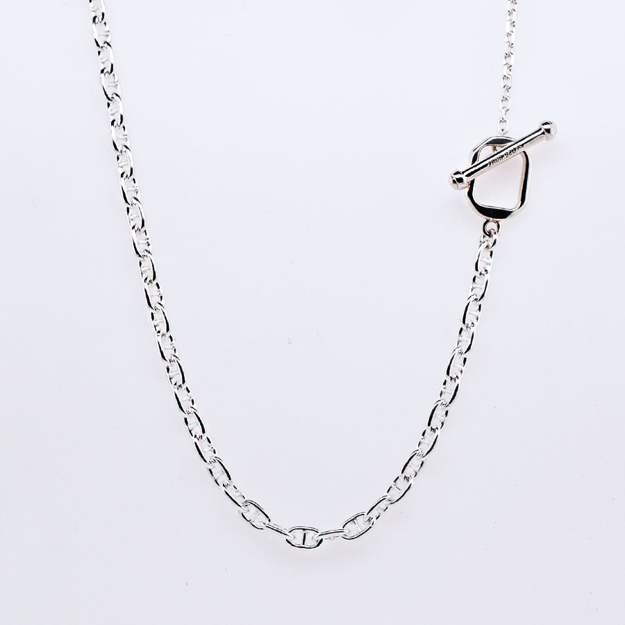70cmのシルバーチェーンに配されたマンテル留めが、シンプルな中に凛とした存在感を添えています。ジェンダーを超えて身につけられるデザインは、スタイルを選ばず自由な表情を楽しめる。