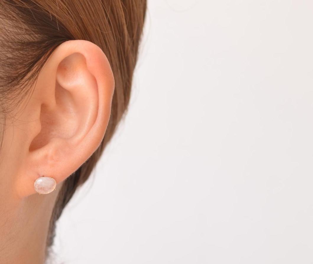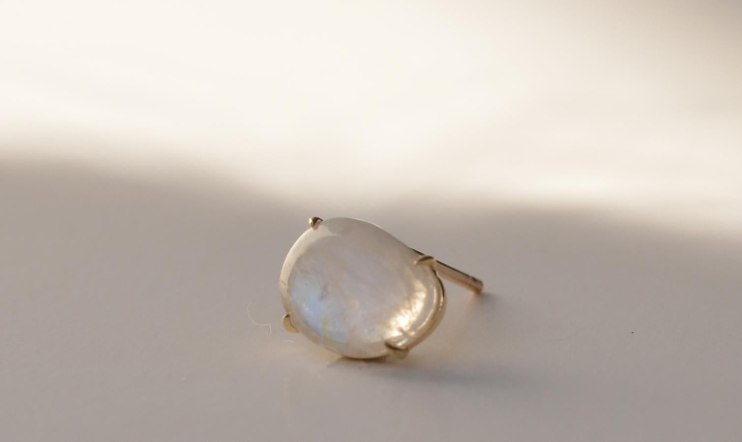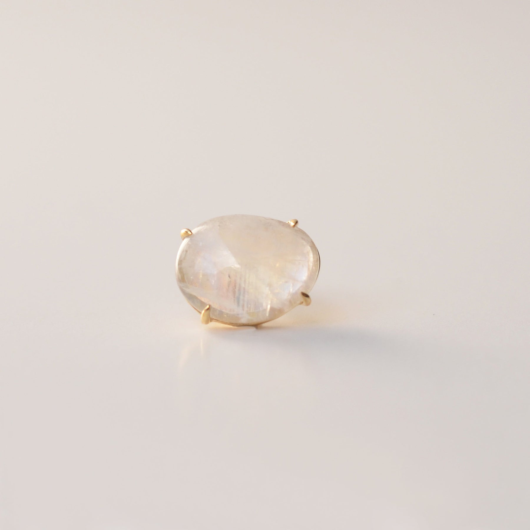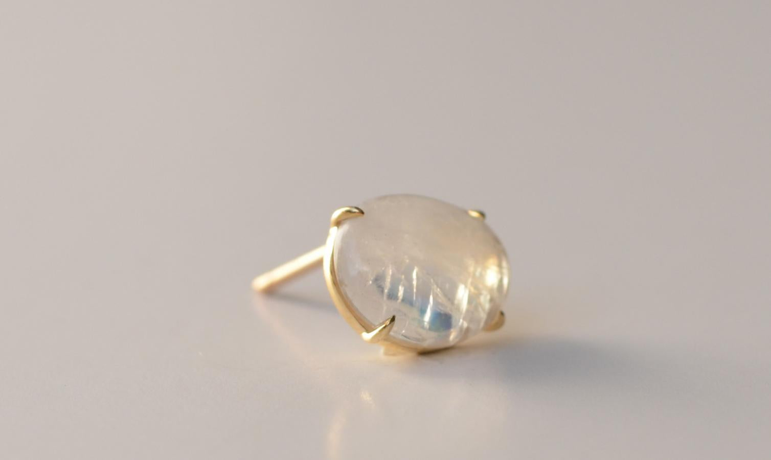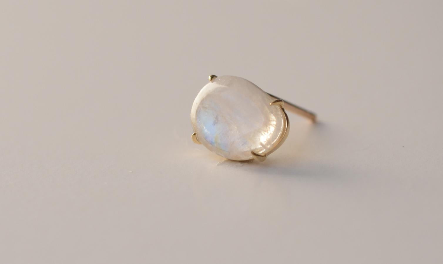 ラフカットしたレインボームーンストーンを4本の爪で留めたピアス。 こだわりのカットが愛着をわかせ、いつまでも身につけたいと思わせてくれるアイテムです。
