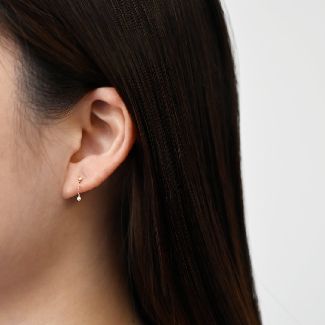 小さなダイヤモンドは耳の上でひと粒の光を放ち、真っ白なパールはまるでこぼれ落ちる雫のように、やわらかく揺れ動きます。
