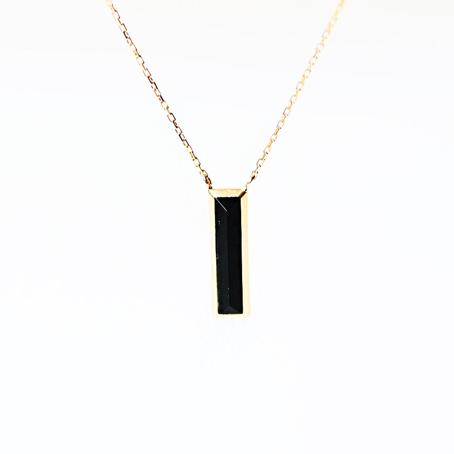 一体感を生み出す技法を用いた作品です。地金の金色とオニキスの黒のコントラスト、くっきりと傾斜を出した宝石の美しさを表現したクールなコレクション。