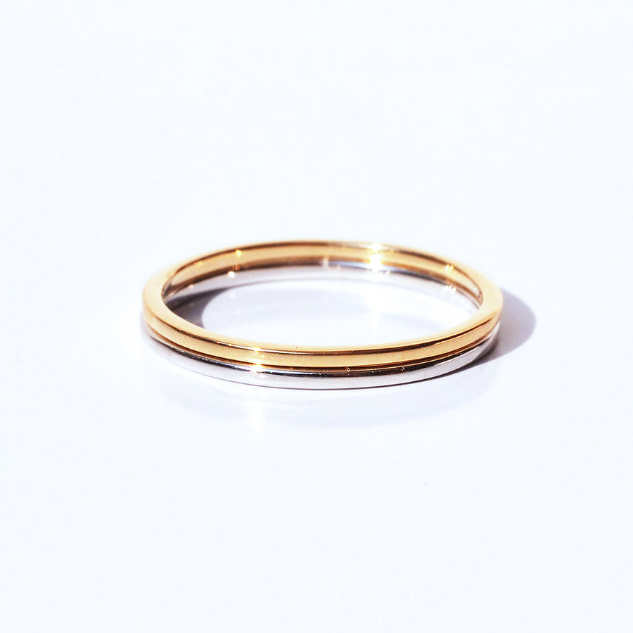 計算された、細さとバランスの二連リングは、男性の方にも好評です。 女性の方はあえて真ん中に異なるリングをセットし、3連リングにしてもおしゃれに。