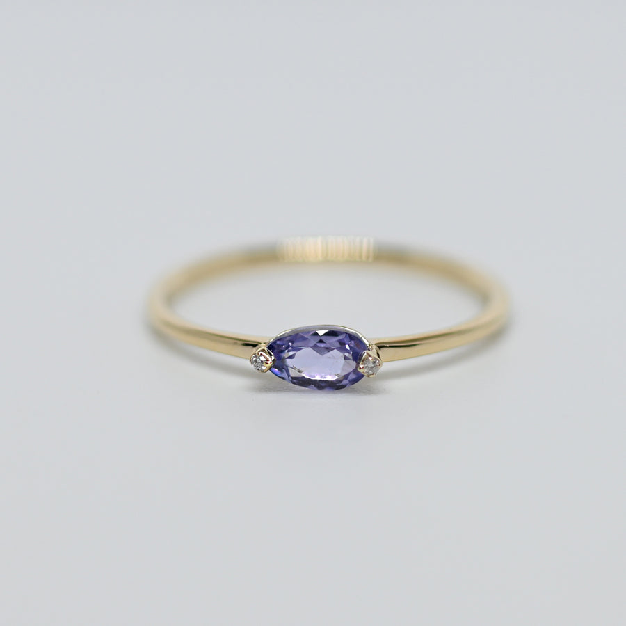 オリジナルカットを施した神秘的な青紫色のタンザナイトを中心に、2つのダイヤモンドが寄り添うデザインは、夜空に輝く星々を思わせます