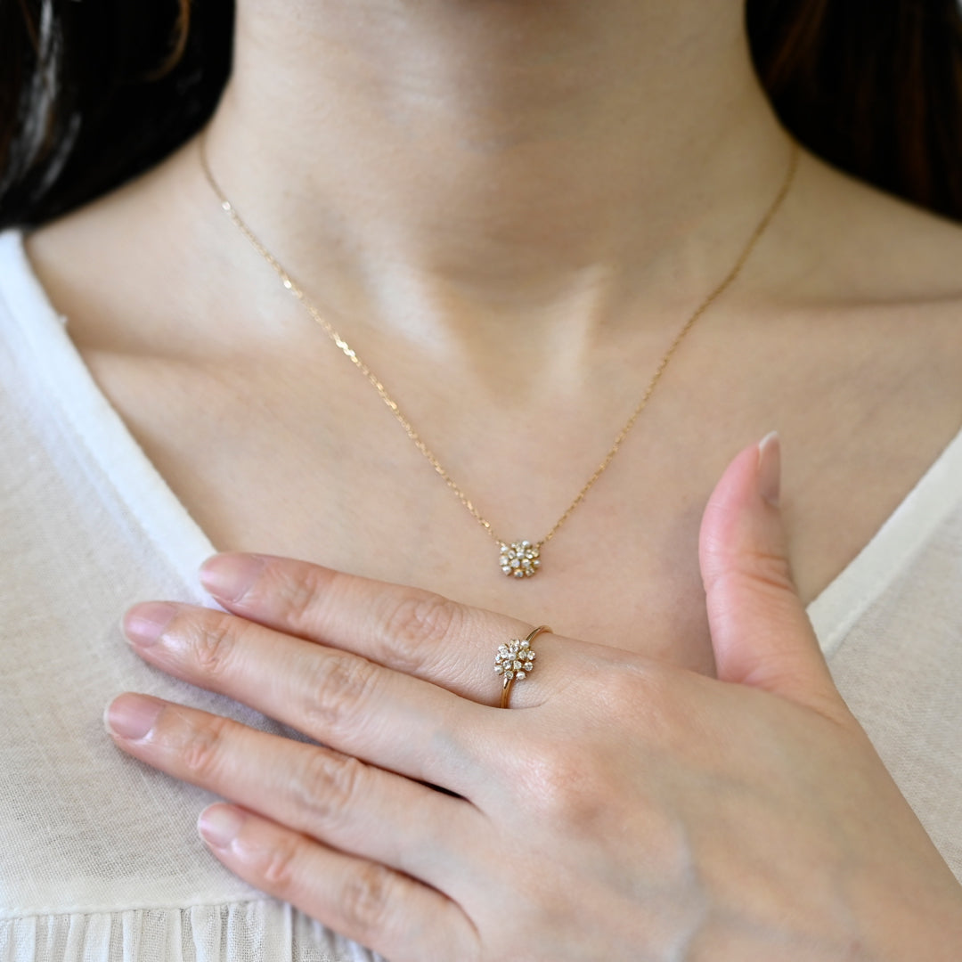 シードパールと、レインボームーンストーンとホワイトトパーズで表現したコレクションです。レインボームーンストーンをセットすることで花弁のはかなげな薄さを、ホワイトトパーズはまるで朝露や雨で輝くように。そしてシードパールはシロツメ草の白さを強調しています。