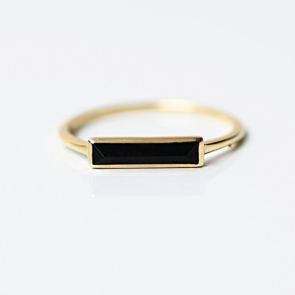 一体感を生み出す技法を用いた作品です。地金の金色とオニキスの黒のコントラスト、くっきりと傾斜を出した宝石の美しさを表現したクールなコレクション。
